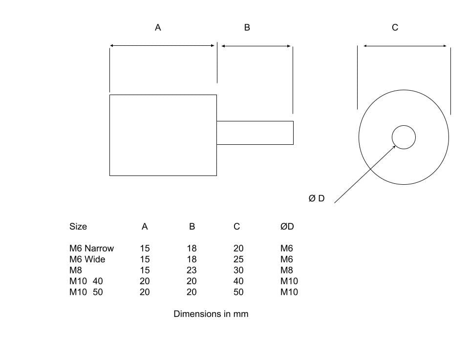 M10 thread x 50mm dia x 20mm thick (rubber part) x 20mm long thread. Overall length 40mm.